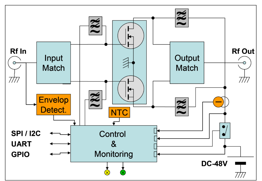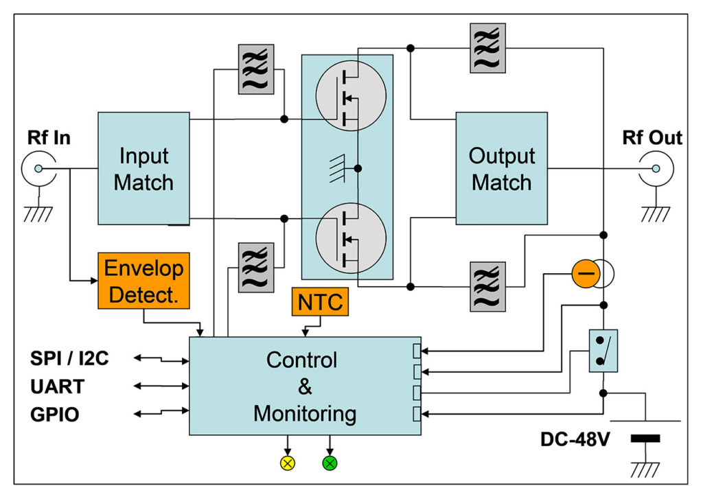 A 8bit/64MHz microcontroller, acquire all working voltages, currents, and temperatures acting bias control, protection and monitoring function. All the working parameter are available through serial port supporting various kind of protocols.
